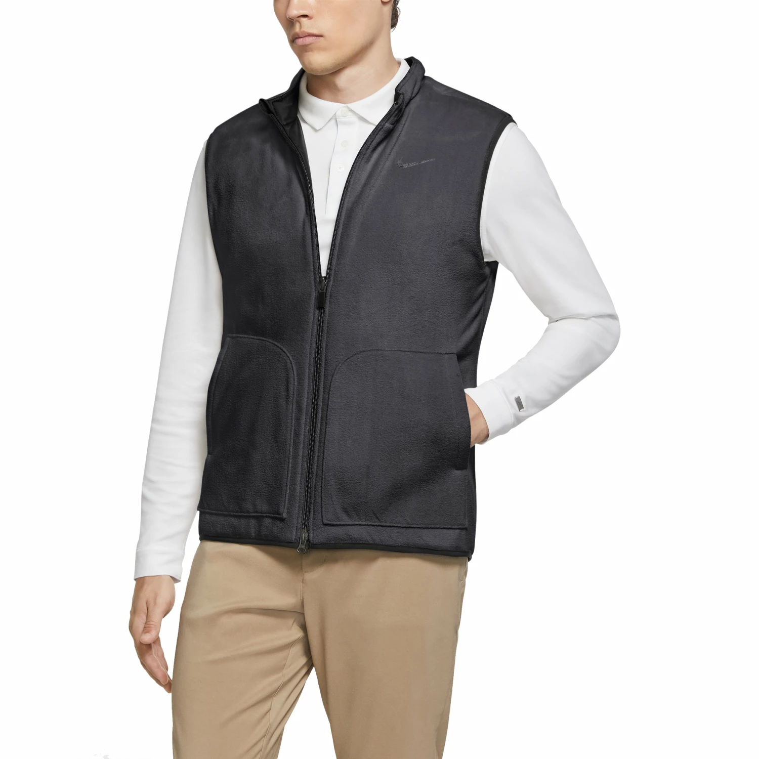 Add some warmth so you can keep swinging in cool weather with the Nike Reversible Synthetic Golf Vest. This water-repellent layer has a reversible design that allows you to choose between a soft fleece or a smooth quilted finish and it comes with synthetic insulation that lets you stay warm even when its cold and wet. There is a two-way zipper that lets you adjust the fit even with your glove on and a zipper garage at the collar feels smooth against your neck.