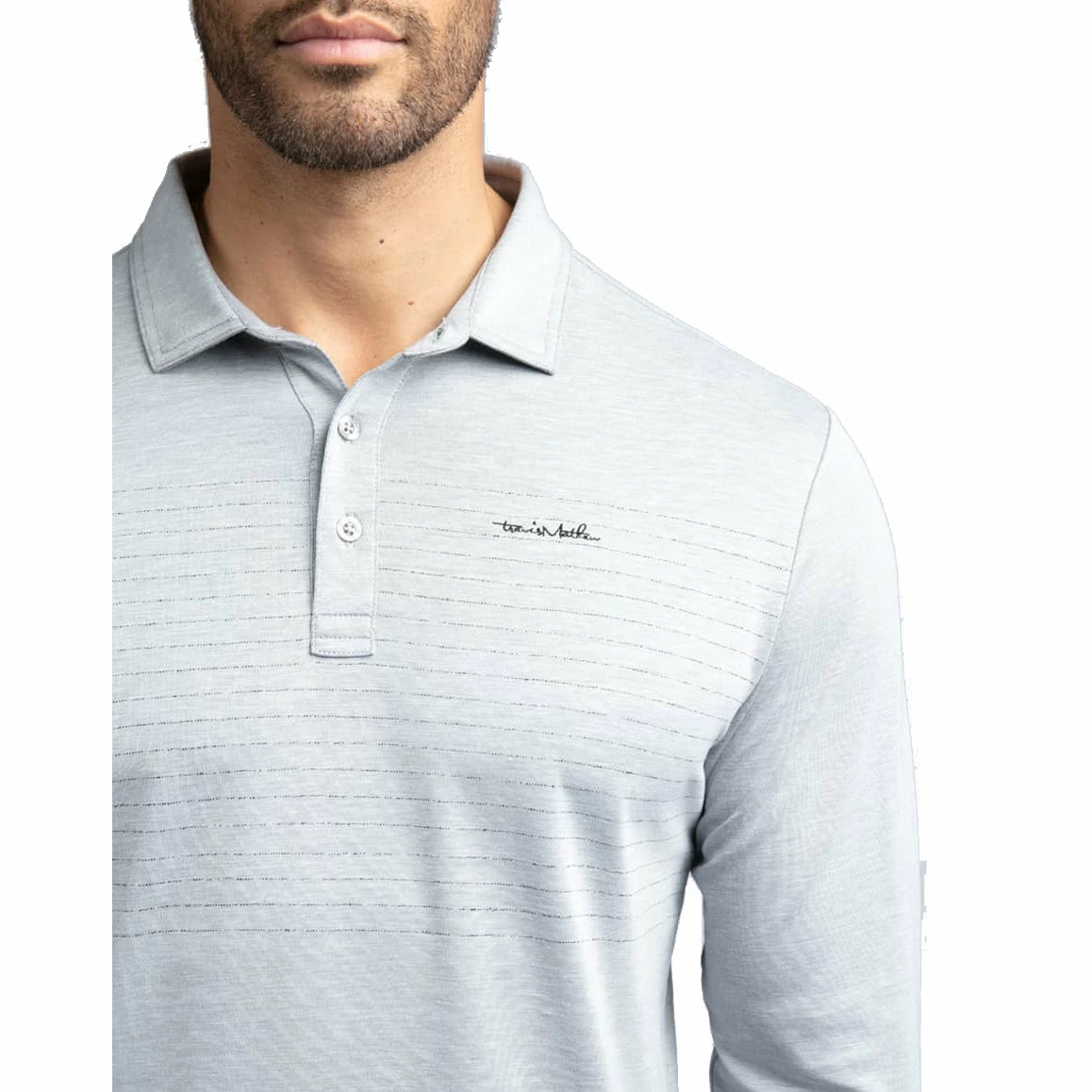 - Grey polo with distressed chest stripes